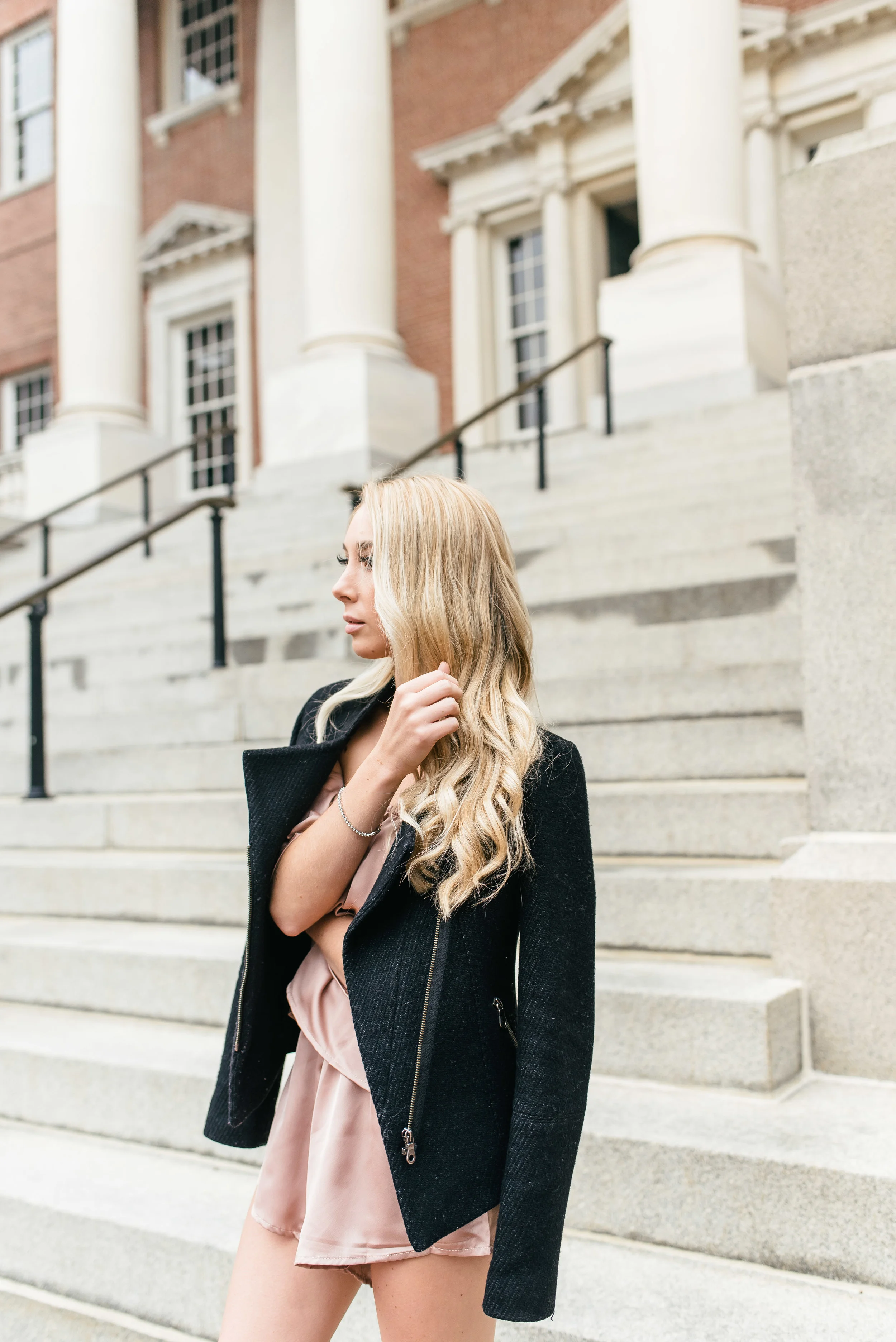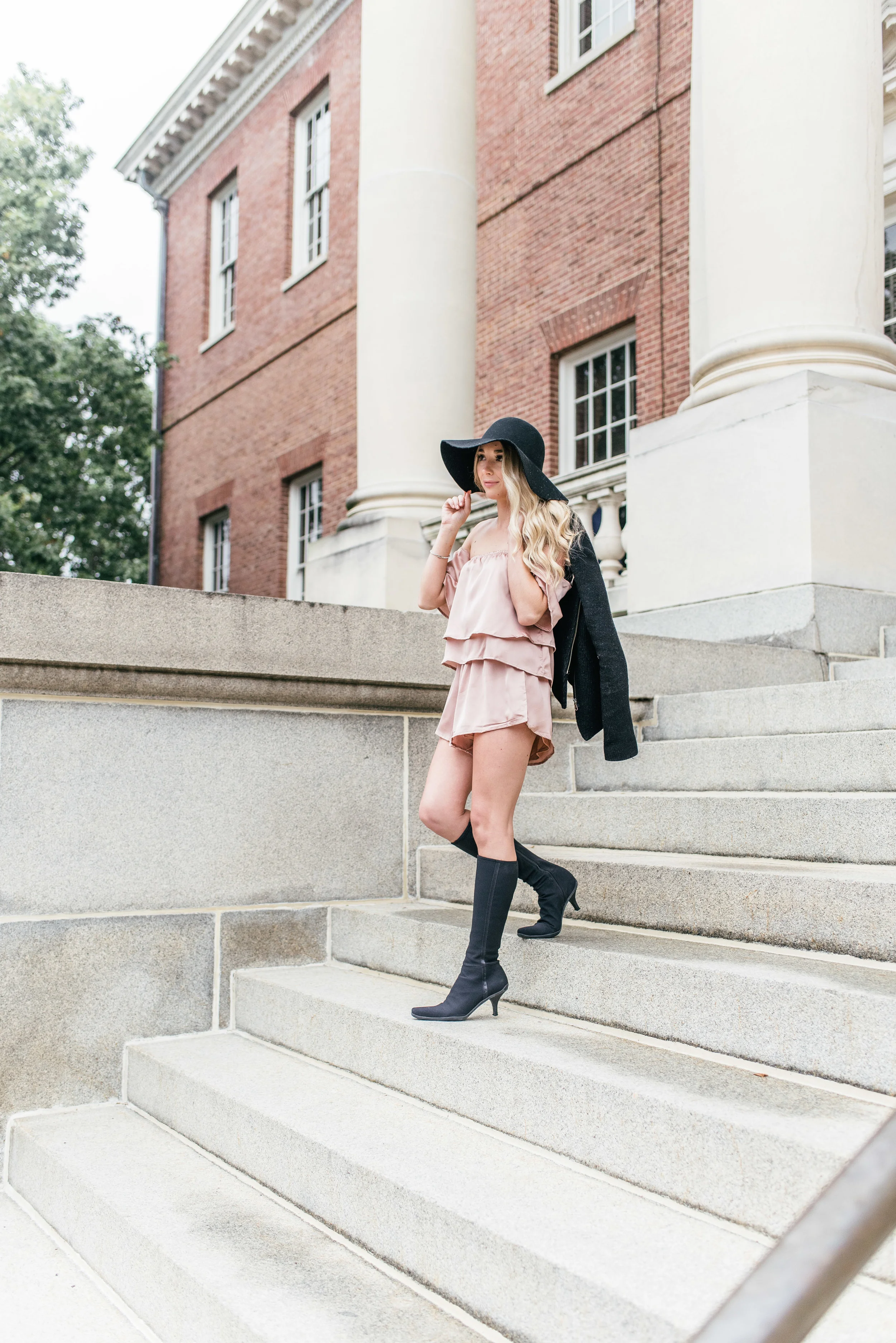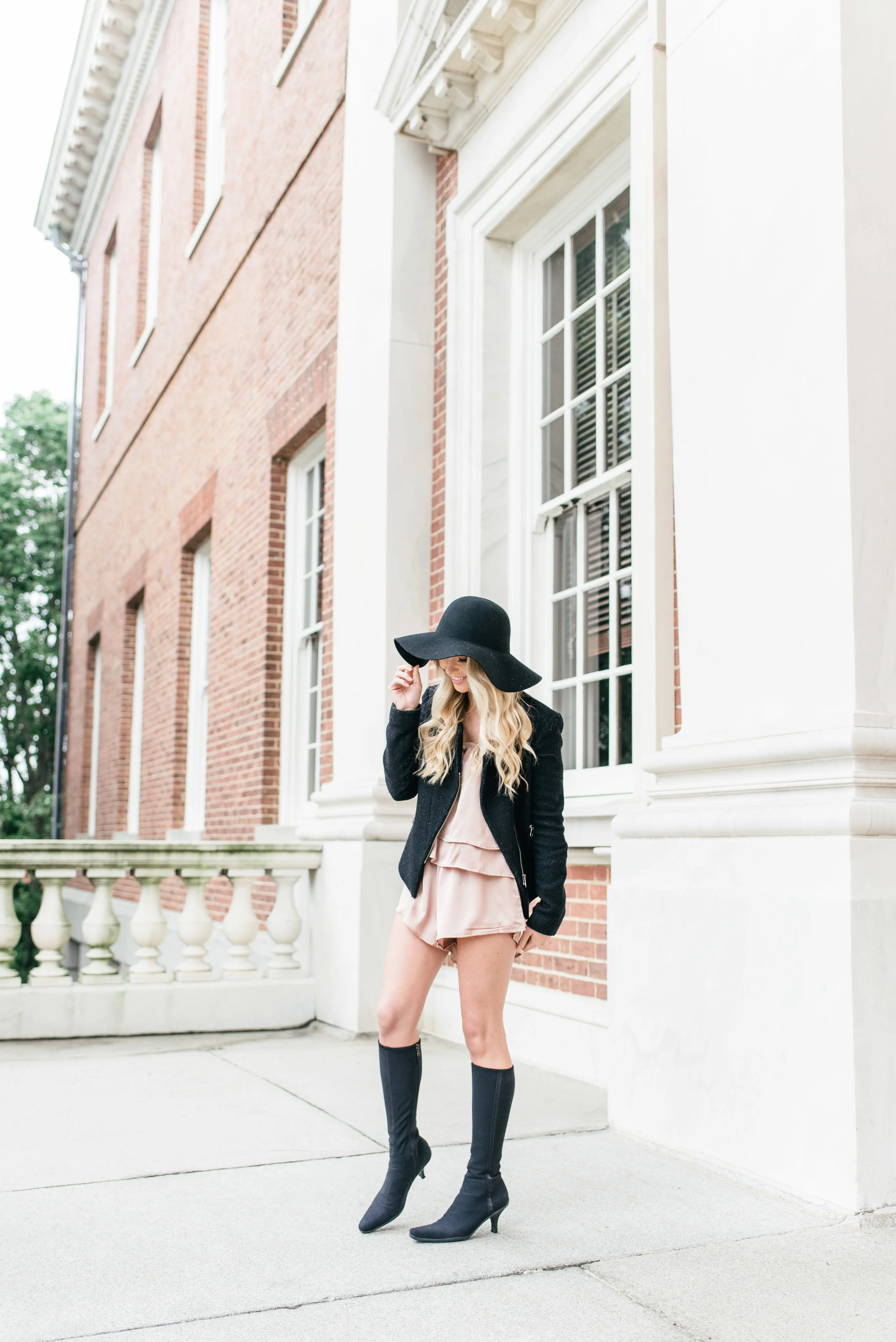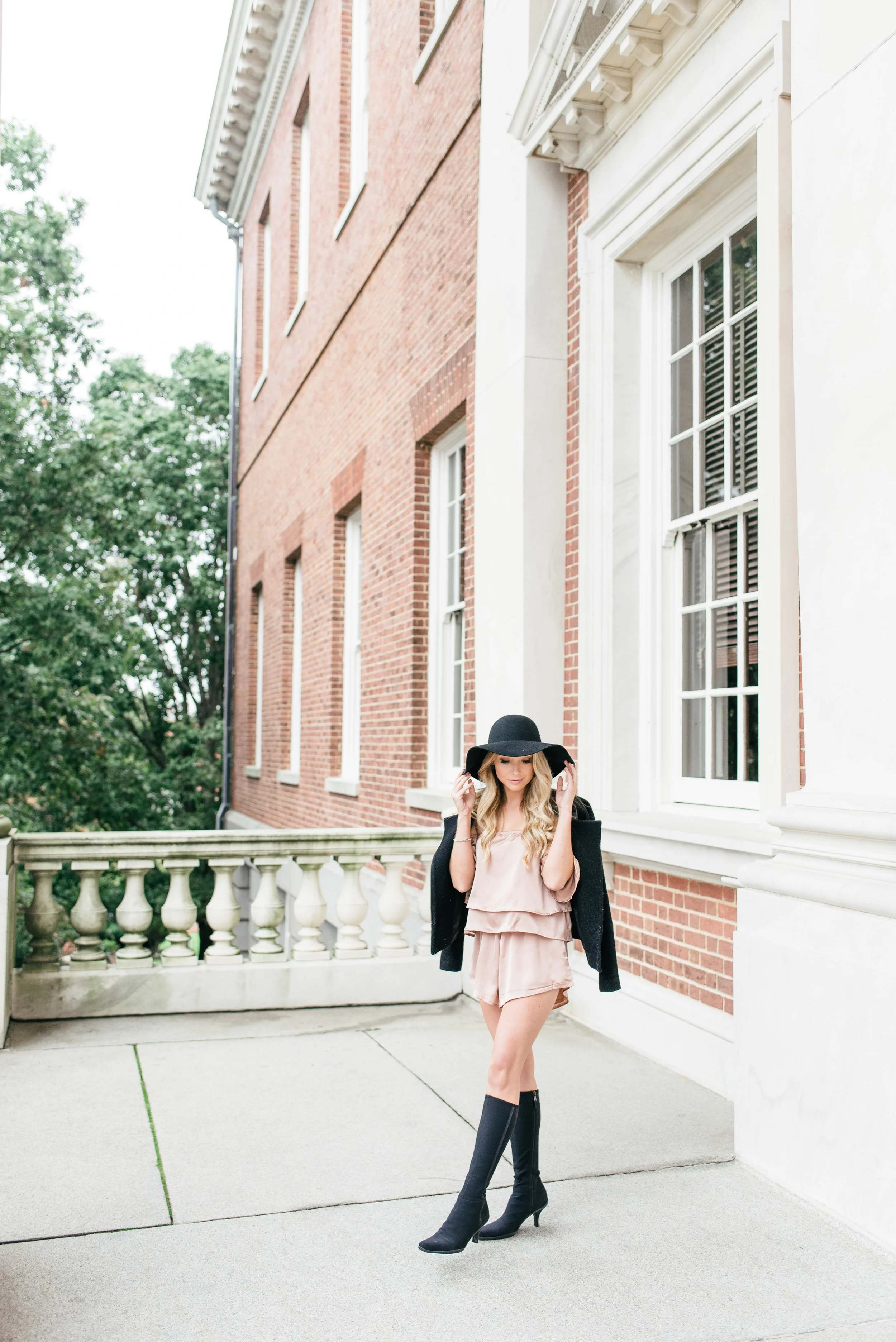 One of the things that I love most about Fall is how creative I can get with my outfits. I love pairing pieces from each season together in a way that only makes sense for an in-between month like October. That's why this feminine, satin romper worked perfectly with knee-high boots and my black moto jacket for a date night downtown.