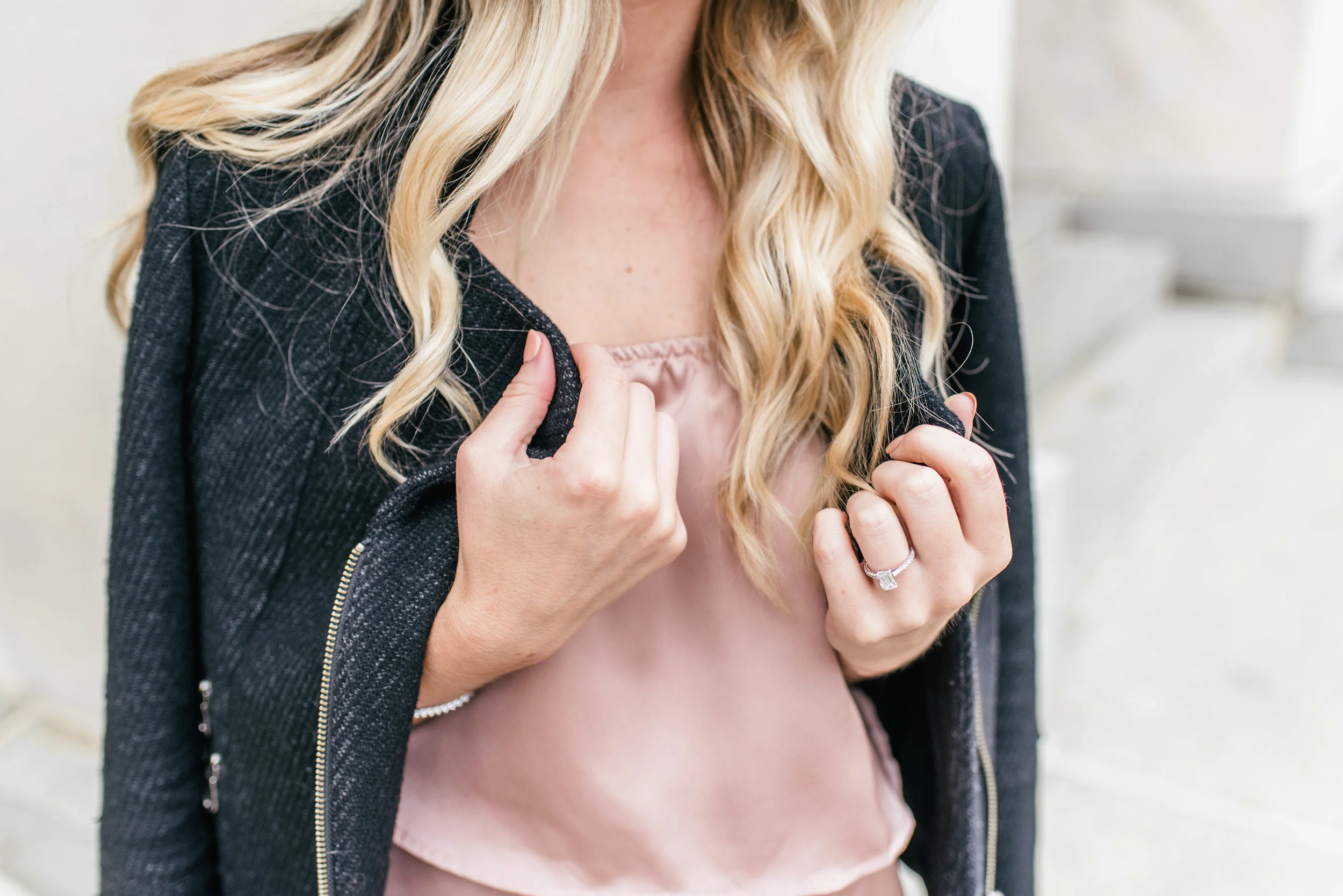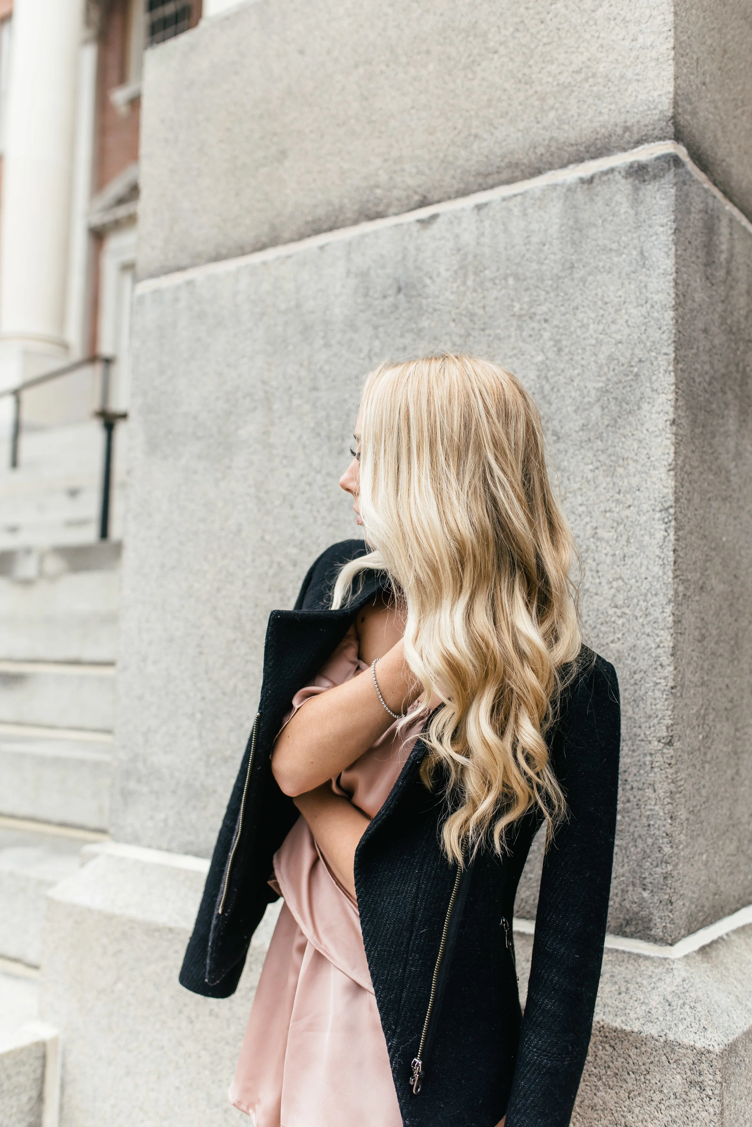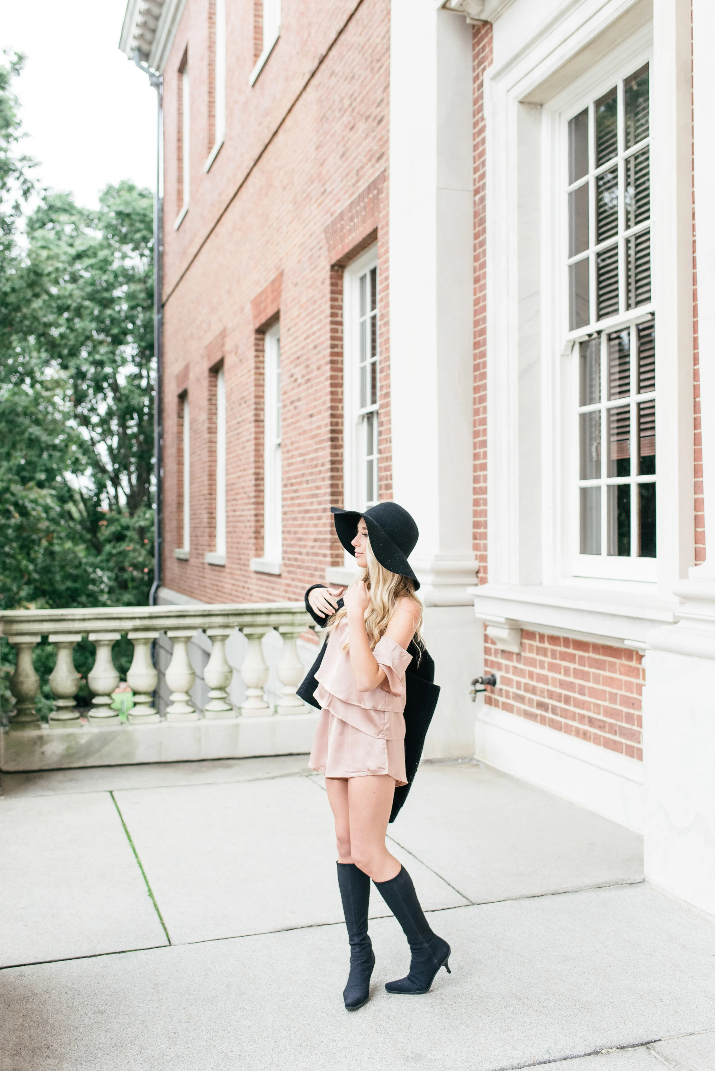 Another one of my favorite pieces for transitioning into Fall is this layered satin romper from Tobi. Bonus: it's less than $80! The dusty pink color fits perfectly with my feminine wardrobe, but isn't too bright for the cooler temperatures.