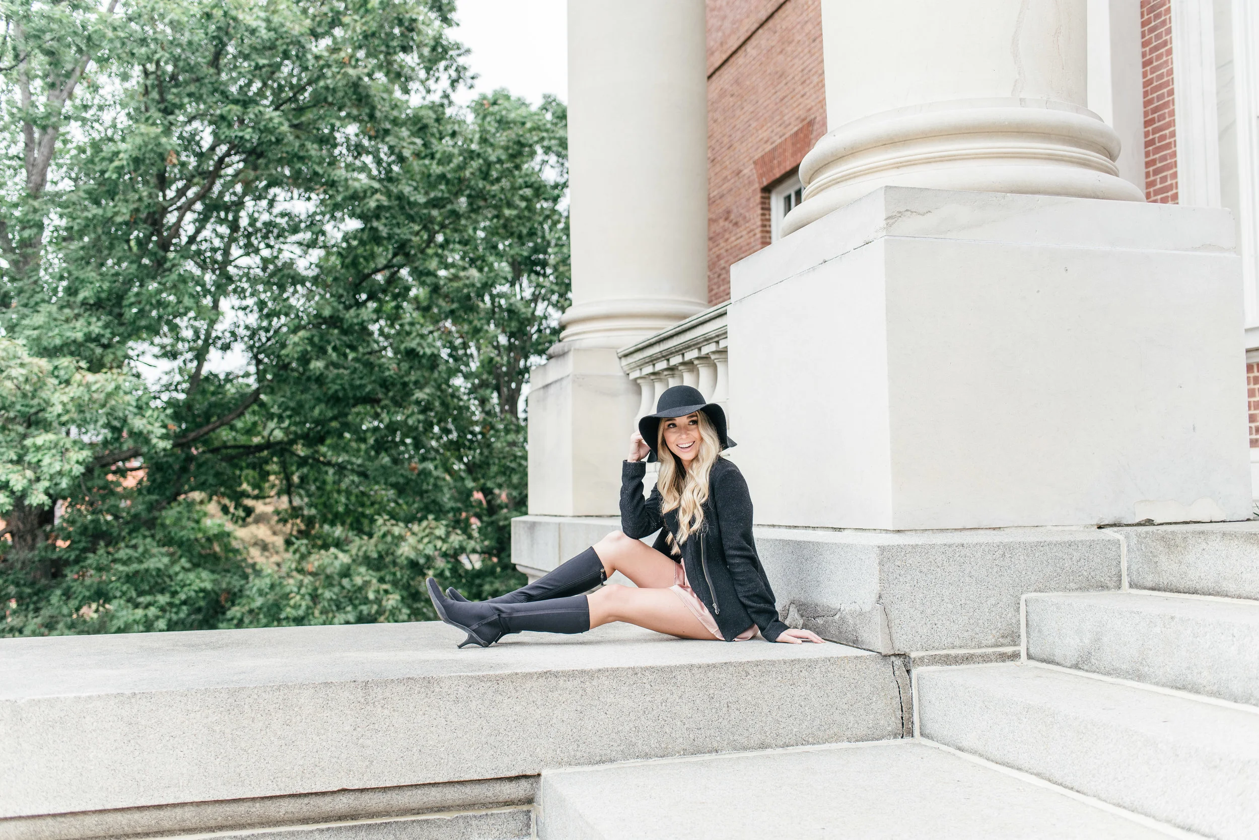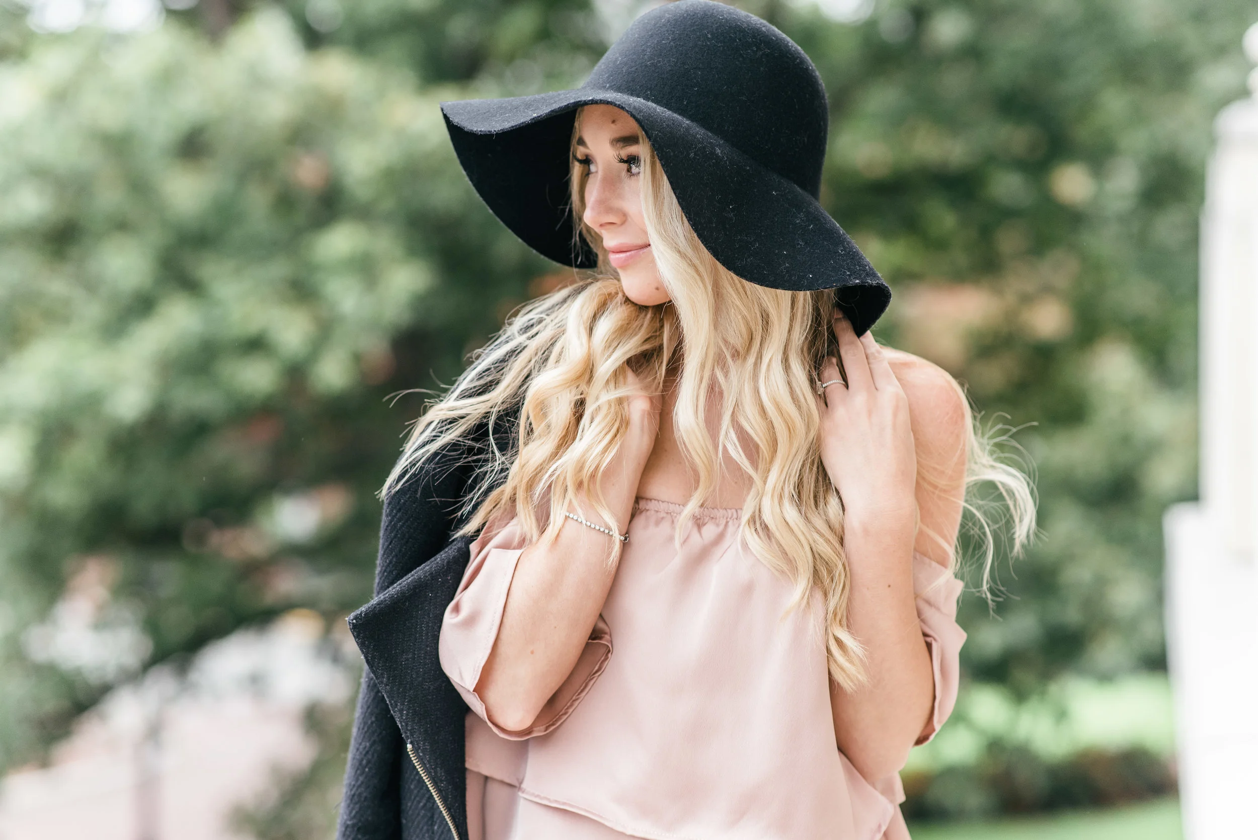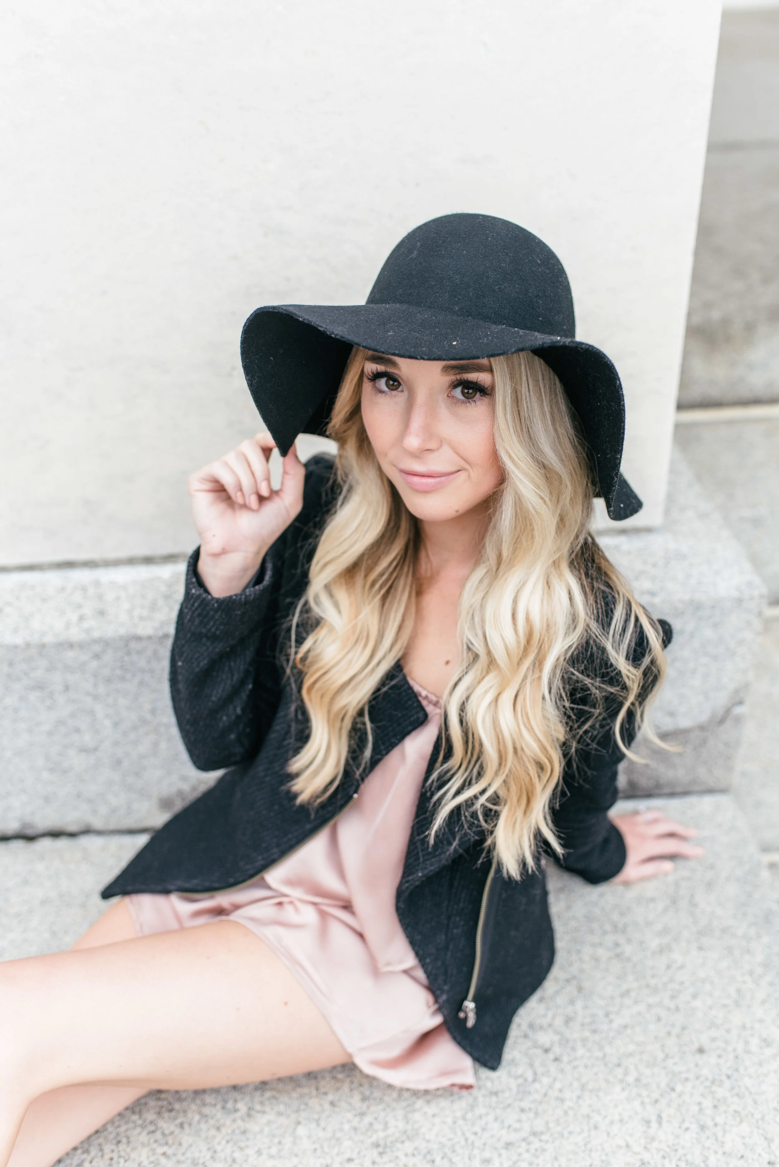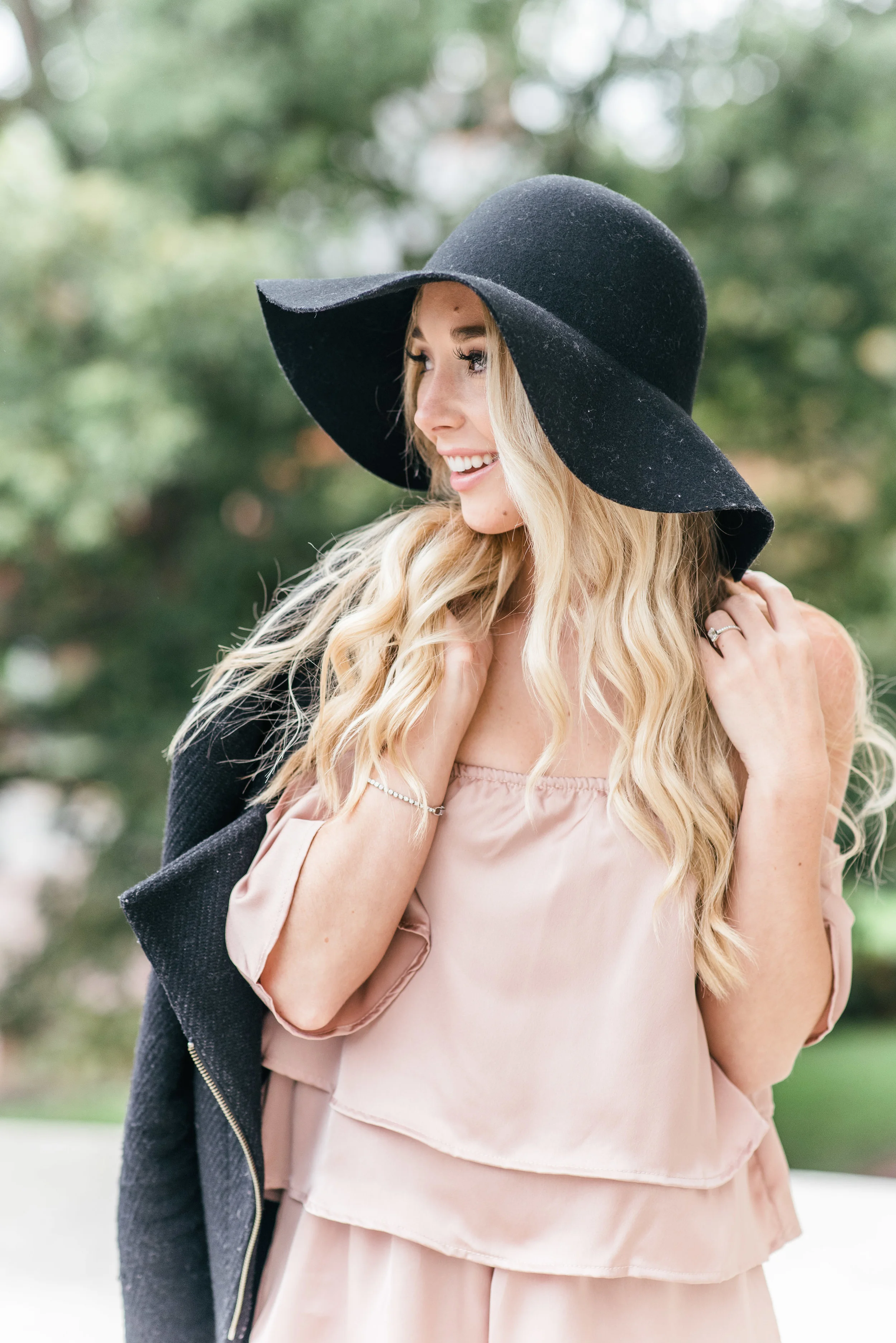 I kept my accessories simple in order to highlight the details on the romper and jacket. All I needed was a floppy black hat, and my favorite crystal tennis bracelet to complete this look!