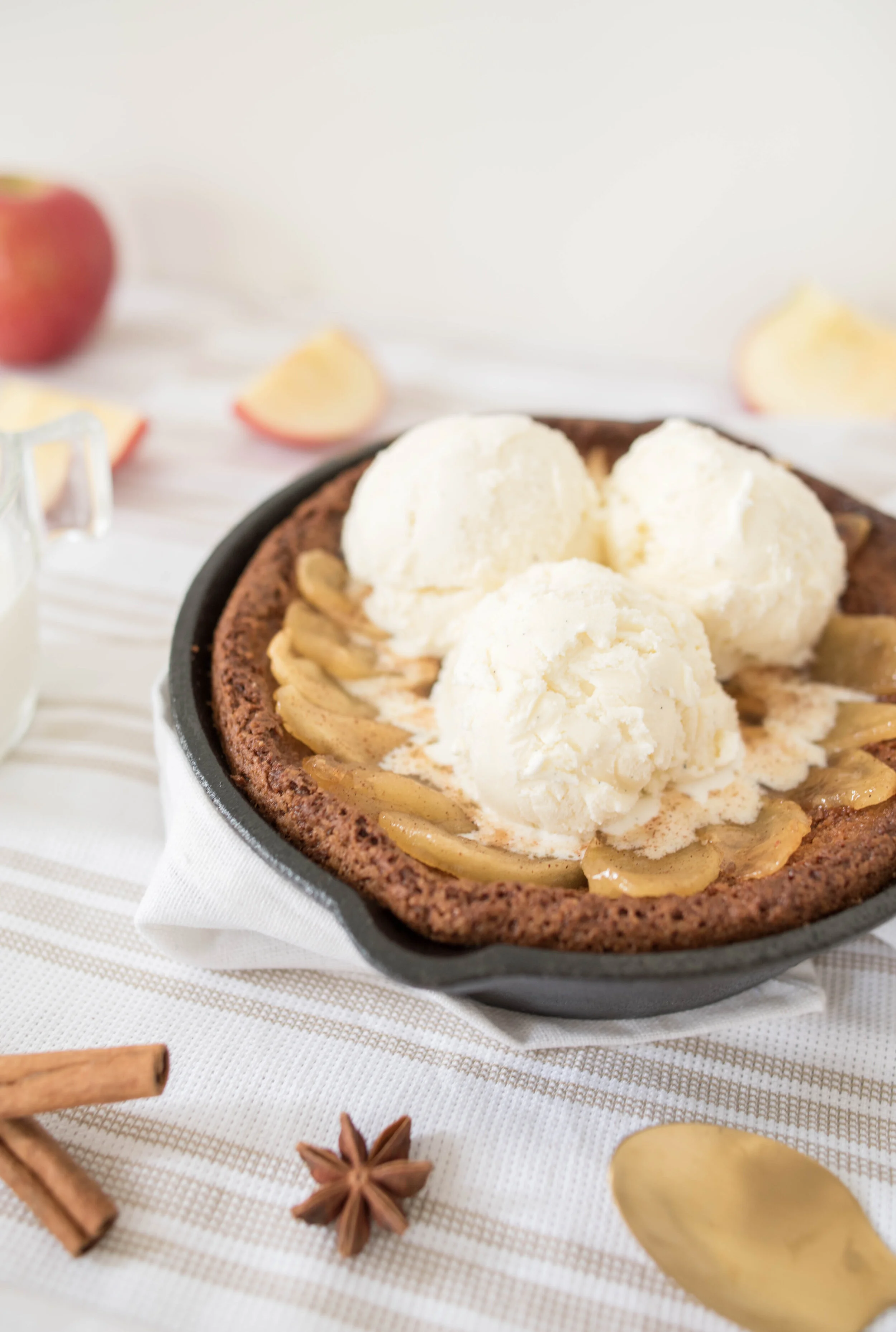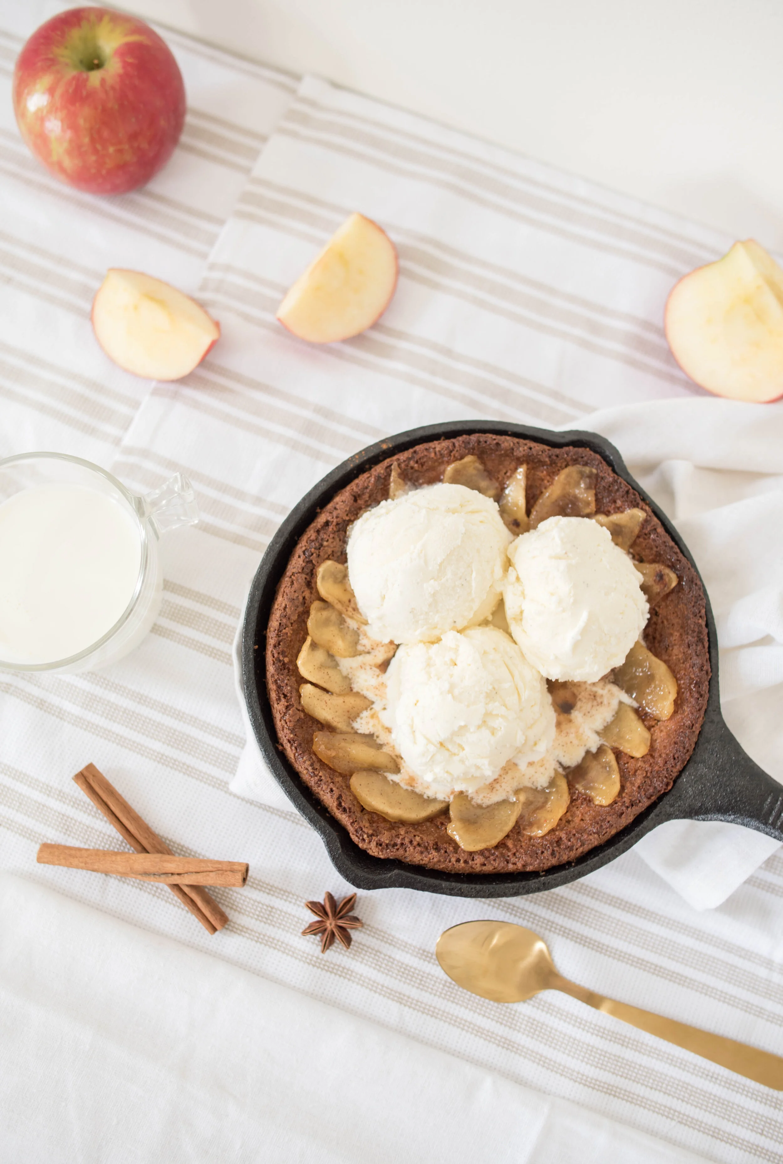 Now… I may or may not have a great place to start (psssst: see below). This Gluten-Free Apple Cinnamon Blondie Skillet is not only a freaking blast to create, but it will make your house smell incredible, and your tastebuds jump with joy. The inside is filled with gooey warm blondie with pieces of caramelized apples in every bite, and the outside is crispy and decadent. Top it with a few scoops of vanilla ice cream and you’ve got the perfect combination of hot and cold, salty and sweet.