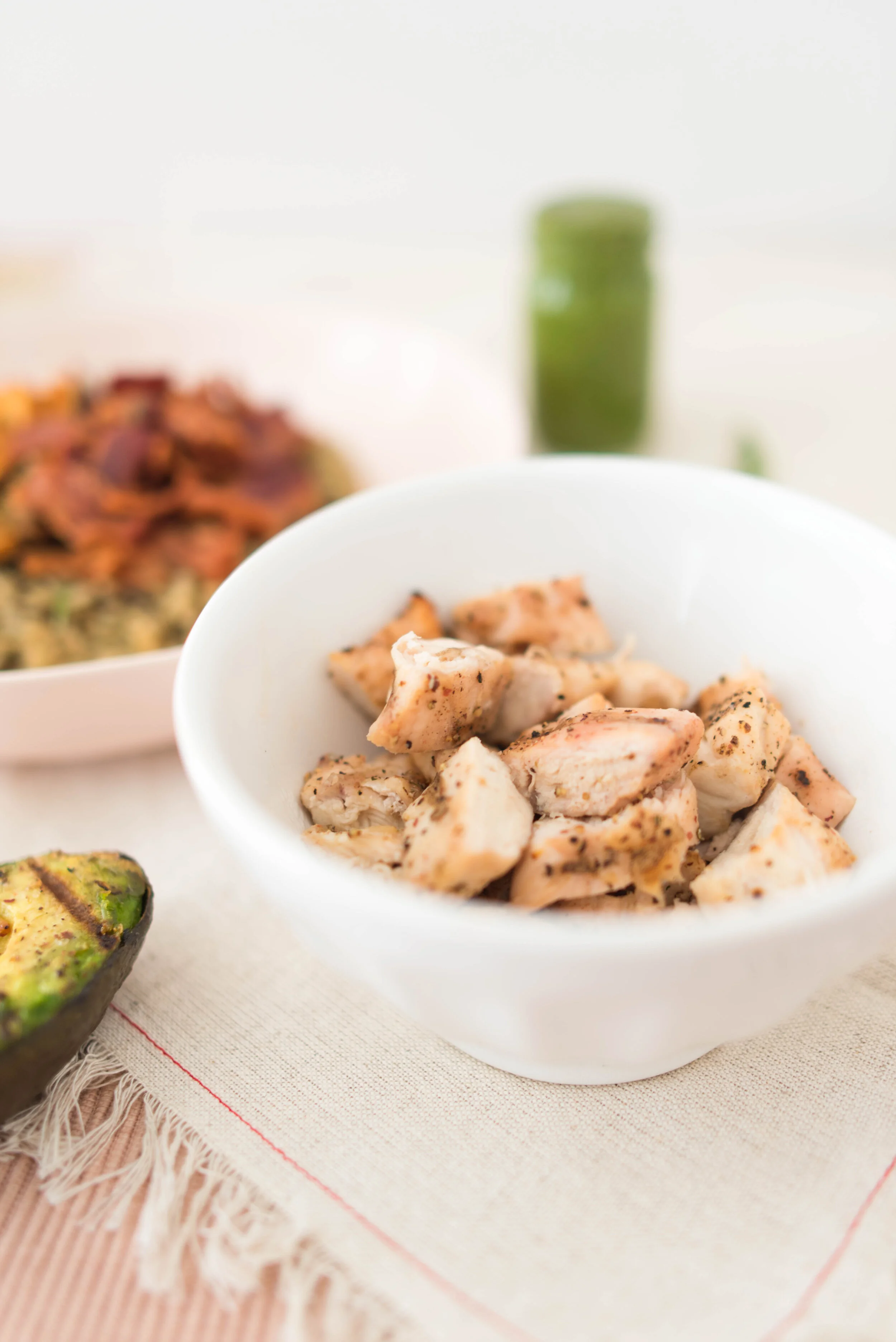 Now, because this recipe is so versatile, I am going to break the formula down into 6 simple parts for you: Start with a solid base (rice or salad mix), then add a protein (chicken, steak, sausage, fish, shrimp, or tofu), a creamy vegetable (roasted sweet potato and/or sautéed mushrooms), smoky flavor (grilled avocado or asparagus), crunchy topping (bacon, croutons, nuts/seeds, or tortilla strips), and top with a dressing (pesto, balsamic vinaigrette, or hot sauce).